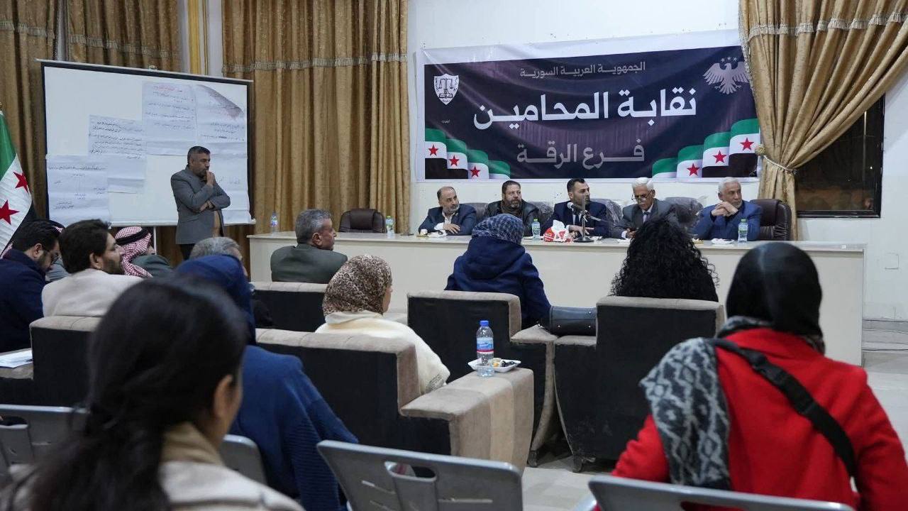 عقدت عدلية الرقة جلسة مجتمعية بالتعاون مع عدد من منظمات المجتمع المدني ونقابة المحامين، لمناقشة مسار العدالة الانتقالية في المحافظة، وذلك في مقر نقابة المحامين بمدينة الرقة.