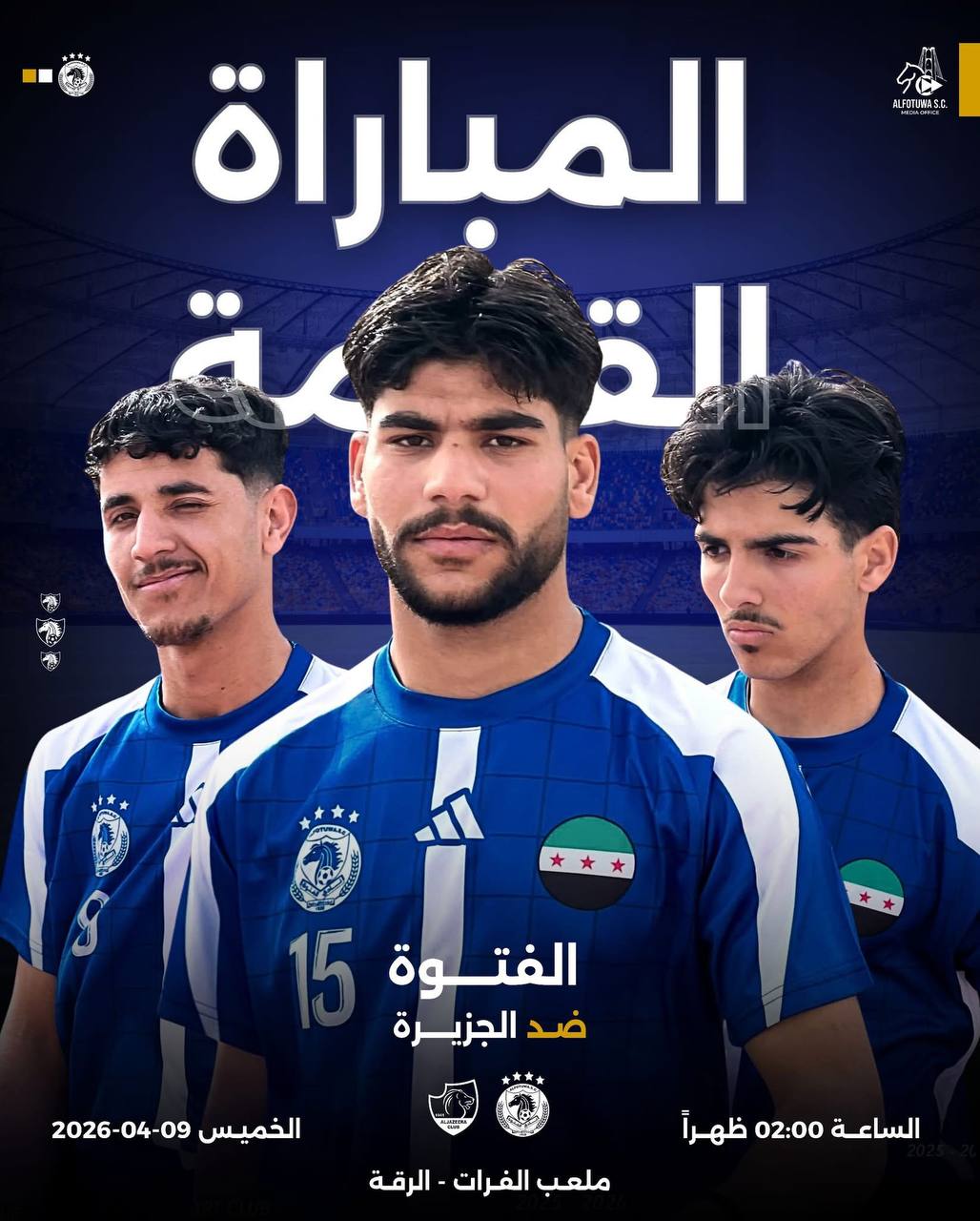 تقام اليوم الخميس 9 نيسان مباراة مؤجلة من مرحلة الذهاب ضمن منافسات الدوري السوري لكرة القدم لفئة الشباب لموسم (2025–2026)، حيث يلتقي فريق الفتوة مع نظيره الجزيرة.