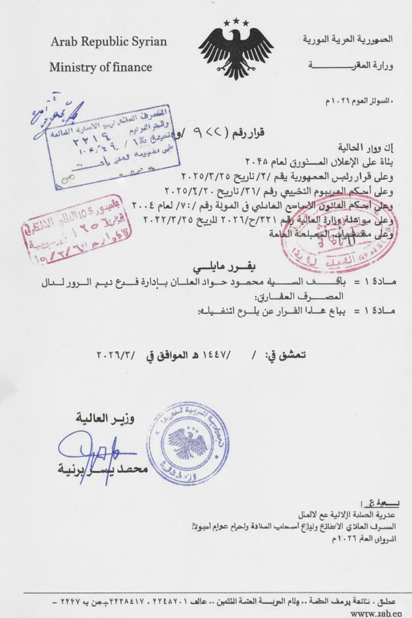 العنان مديراً لفرع المصرف العقاري بدير الزور عين الفرات في 10 نيسان , 2026 شارك FacebookTwitterWhatsAppTelegramFacebook Messenger أصدر وزير المالية السيد محمد يسر برنية قراراً تم بموجبه تكليف محمود جواد العنان مديراً لفرع المصرف العقاري بديرالزور