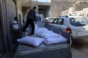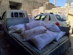 داخل مستودعين ضمن أحياء المدينة، حيث كانت معدّة للتفريق بأكياس أخرى وخلطها مع طحين الإغاثة، ليتم تجهيزها وطرحها في الأسواق الحرة بطرق غير قانونية.