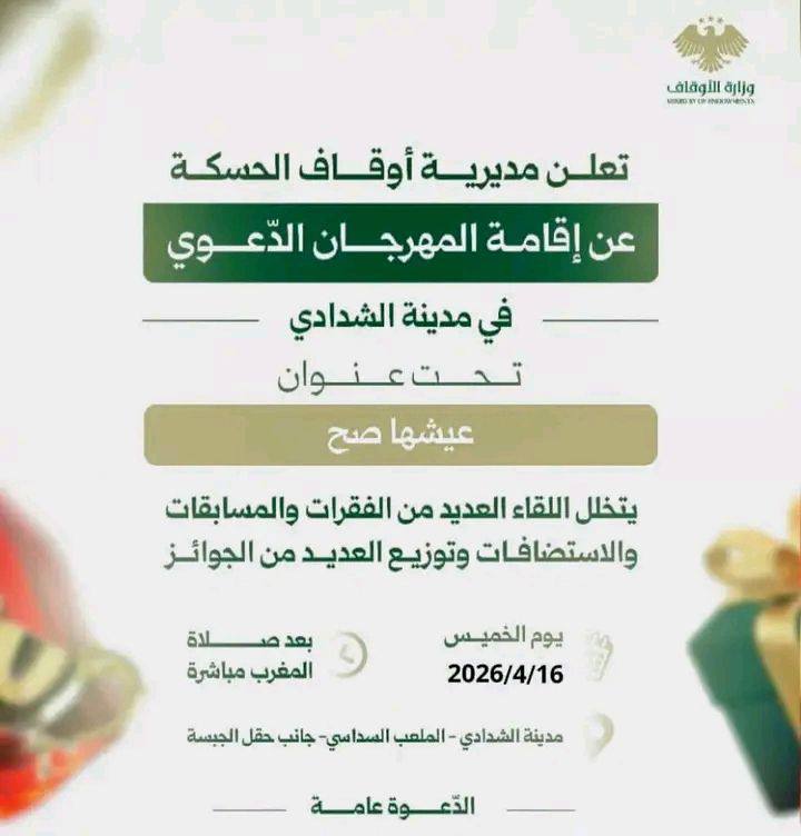برعاية مديرية الأوقاف في محافظة الحسكة، تُنظَّم مساء الخميس فعاليات المهرجان الدعوي الأول في مدينة الشدادي تحت شعار “على محبة الله نلتقي”.