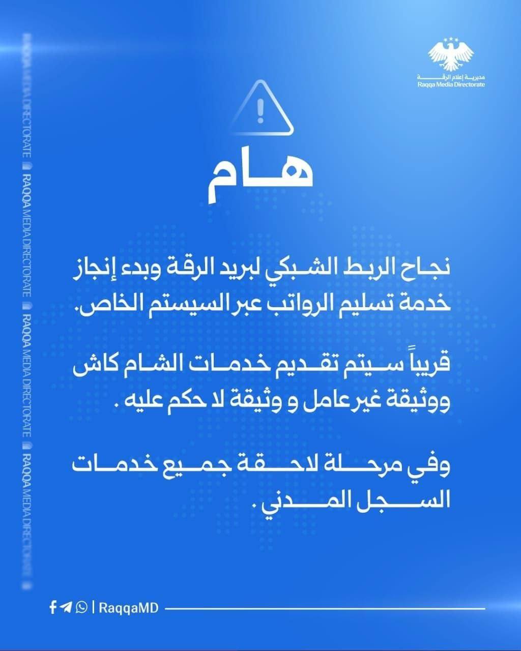 أعلنت مديرية إعلام الرقة عن تفعيل خدمات الربط الشبكي وإطلاق منظومة الرواتب، في خطوة تهدف إلى تسهيل الإجراءات الحكومية وتحسين الخدمات المالية للمواطنين.